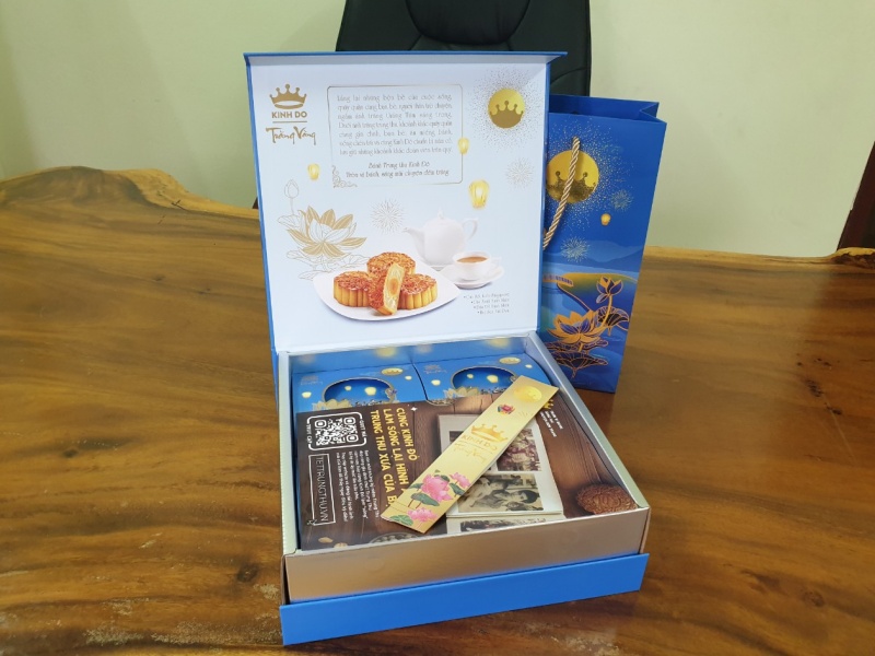 Bên trong hộp bánh trung thu trăng vàng Hồng ngọc An bình với thiết kế tinh tế, sang trọng.